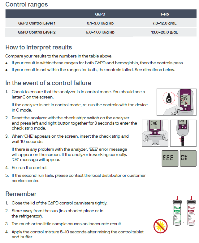 The STANDARD G6PD System is an enzymatic colorimetric assay intended for the semi-quantitative measurement of G6PD activity and total hemoglobin (T-Hb) concentration in non-anticoagulated capillary (finger-stick) whole blood or venous whole blood (K2-EDTA, sodium heparin, or acid citrate dextrose [ACD]). The STANDARD G6PD Test System is indicated for diff erentiating normal, intermediate, and defi cient G6PD activity levels to aid in the detection of G6PD defi ciency in individuals and in the determination of hemoglobin level. The test will provide results expressed as the ratio of units of G6PD activity per gram of hemoglobin (G6PD U/g Hb) which can be used to determine G6PD status. Samples which generate a G6PD defi cient or intermediate result should be assayed using a quantitative G6PD test to verify a defi ciency. T-Hb results expressed in grams per deciliter (g/dL) are used to determine G6PD status and not state of anemia. T-Hb results should be confirmed by a quantitative test when monitoring disease progression or making treatment decisions. The STANDARD G6PD Test System is intended for use by health care professionals in a laboratory or point-of-care environment. The system is for in vitro diagnostic use only. The STANDARD G6PD Test has not been validated for use with neonatal samples. The STANDARD G6PD Analyzer must be used exclusively with the STANDARD G6PD Test Device, STANDARD G6PD Control, and STANDARD G6PD Check strip manufactured by SD BIOSENSOR.